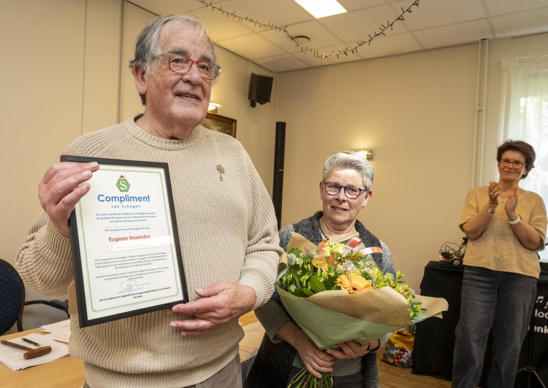 Tijdens de jaarvergadering van de Algemene Bond Ouderen Schagen (ABOS) op 8 april reikte burgemeester Marjan van Kampen-Nouwen het Schager Compliment uit aan de vertrekkende voorzitter: Eugeen Hoekstra.