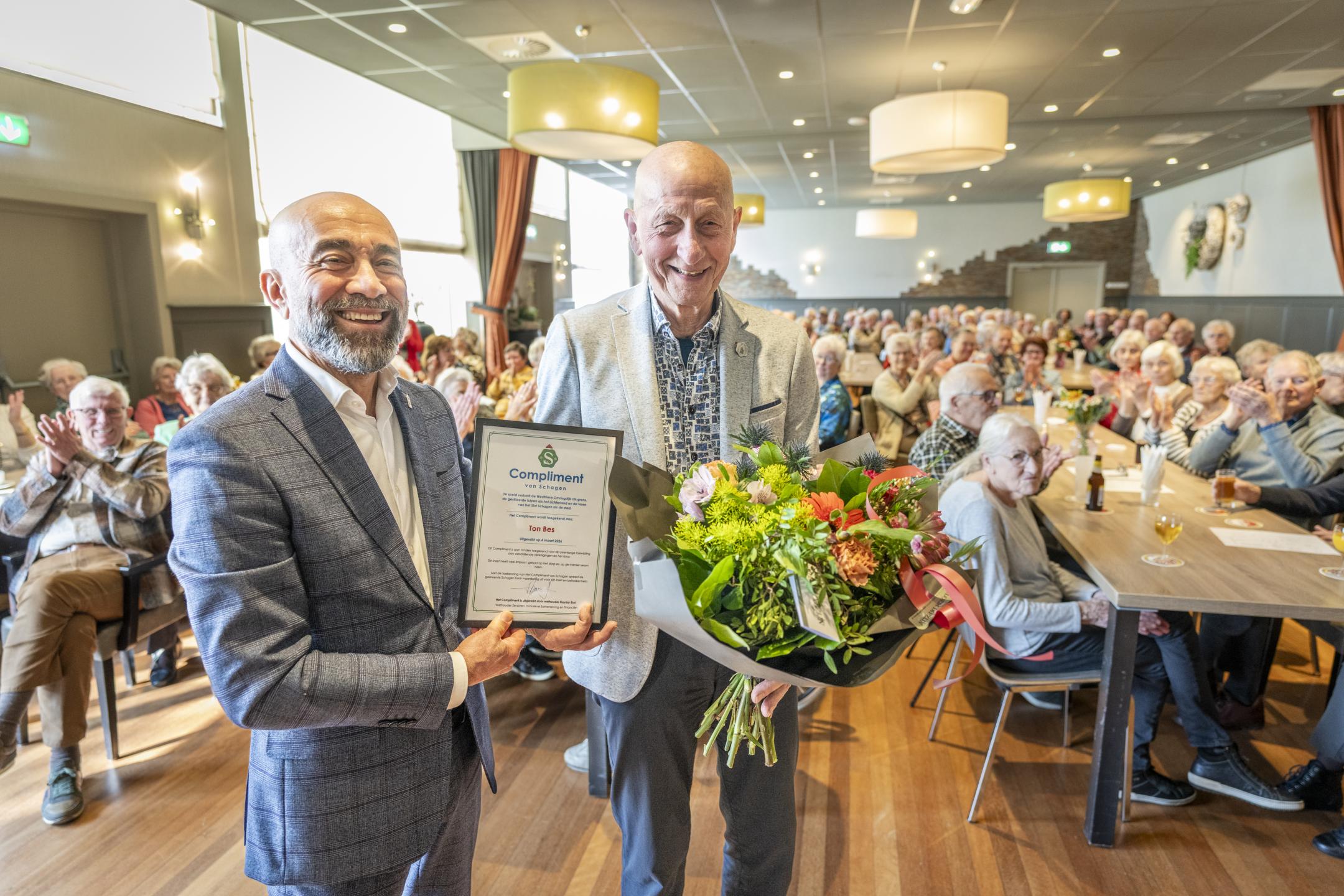 Tijdens de Algemene Ledenvergadering van de Waarlandse Seniorenvereniging KBO op woensdag 4 maart 2026 reikte wethouder Haydar Erol het Schager Compliment uit aan voorzitter Ton Bes. Tijdens deze vergadering werd ook het 55- jarig bestaan van de vereniging gevierd en werd er afscheid genomen van Ton als voorzitter.